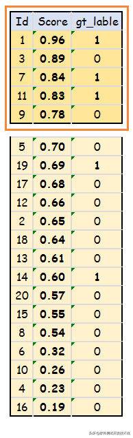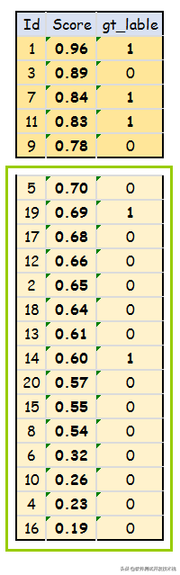 首先算法模型返回所有测试样本的Score,假设共有20个测试样本,每个的样本结果包含Id,Score、Label信息,根据Score降序排序如下: