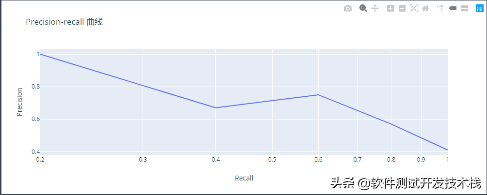 我们通常不满足只通过Top-5来衡量一个模型的好坏,而是需要知道从Top-1到Top-N(N是所有测试样本个数,本文中为20)对应的Precision和Recall。显然随着我们选定的样本越来也多,Recall一定会越来越高,而Precision整体上会呈下降趋势。把Recall为横坐标,Precision为纵坐标,即可得到常用的Precision-Recall曲线。