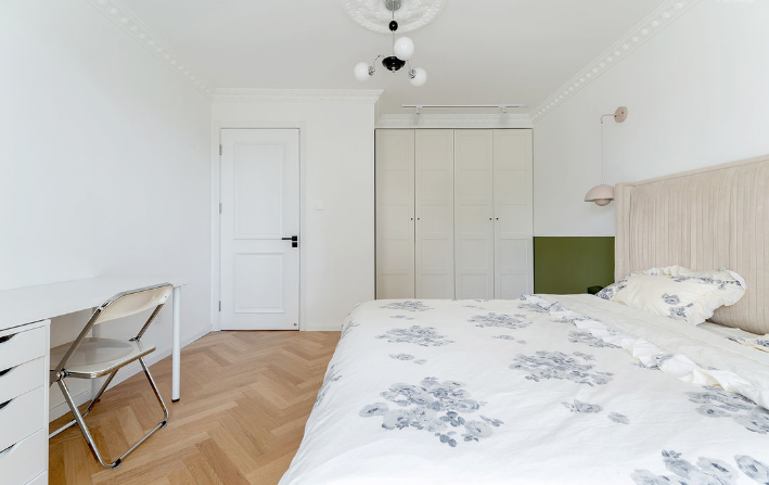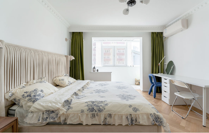 主卧简约复古,延续了客厅的配色方案,白色+原木色+墨绿色,让整体格调更统一。主卧与阳台留恋半截矮墙,界定空间分区,也可以摆放一些绿植。