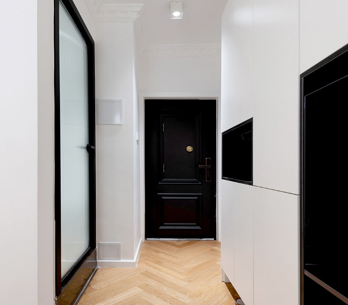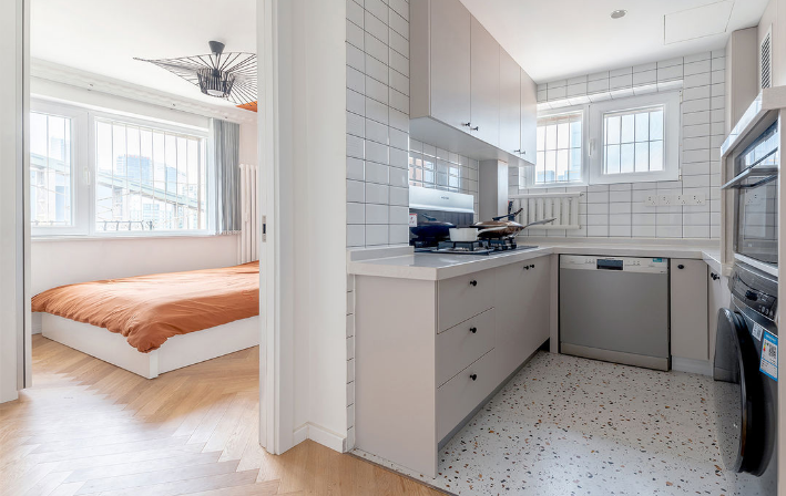 冰箱移至过道,与储物柜完美契合,释放出厨房空间,也不影响日常使用。