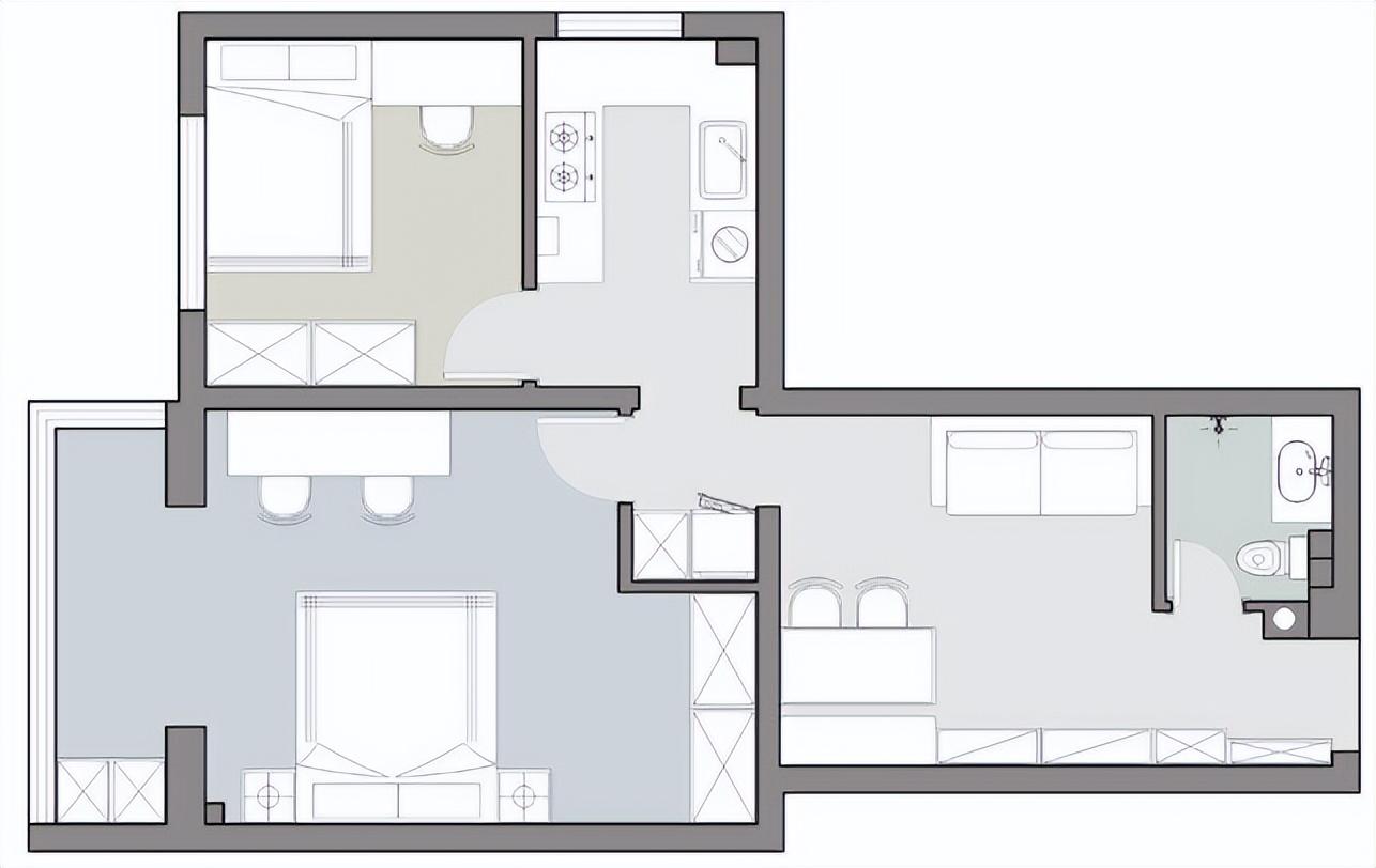 在原有格局上做小改动,以达到最满意的效果。首先,小幅度扩大卫生间,使其使用功能上,更加的齐全。其次,拆除厨房隔墙,打造开放式厨房,引入光线弥补客厅采光上的不足。