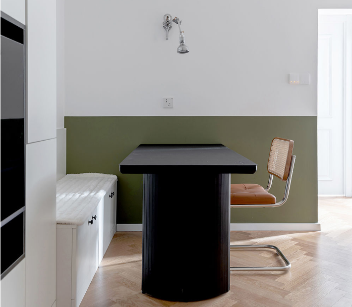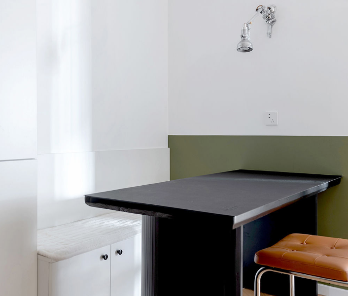 两面一分为二,白色和浅墨绿色结合,活跃空间又拉伸出层次感。