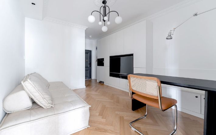 地板摆脱了横平竖直的样式,采用人字型铺贴方式,视觉上形成一种错位,更具观赏效果。沙发选取没有靠背的款式,以灵活的靠枕,改善视觉空间。