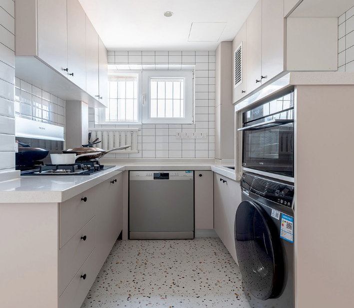 U型厨房布局,提高了空间利用率。没有太多造型设计,素色的橱柜门板,搭配水磨石地面,整洁干净又不失现代感。右侧一组电器柜,收拢了微波炉和洗衣机,实用整洁美观。