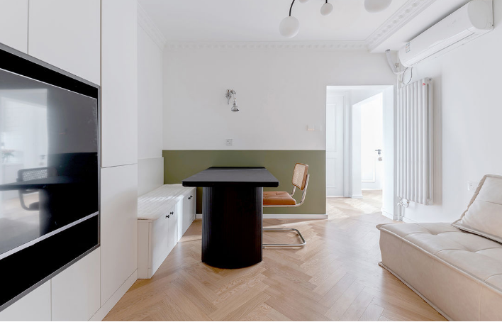 小小的客厅,承载了一家三口日常活跃和用餐功能。整体以白色为主,紧接着铺叙原木地板,尽可能弱化小户型的紧凑,同时注入温馨舒适感。一抹淡淡的墨绿色点缀,为空间增添几分活力。