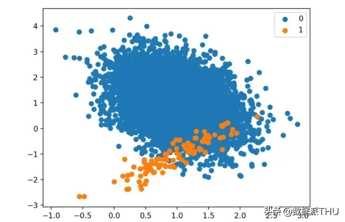 #Generateandplotasyntheticimbalancedclassificationdatasetfrom collections import Counterfrom sklearn.datasets import make_classificationfrom matplotlib import pyplotfrom numpy import where# define datasetX, y = make_classification(n_samples=10000, n_features=2, n_redundant=0, n_clusters_per_class=1, weights=[0.99], flip_y=0, random_state=3)# summarize class distributioncounter = Counter(y)print(counter)# scatter plot of examples by class labelfor label, _ in counter.items(): row_ix = where(y == label)[0] pyplot.scatter(X[row_ix, 0], X[row_ix, 1], label=str(label))pyplot.legend()pyplot.show()运行这个示例将会先创造一个数据集,然后汇总类的分布。
