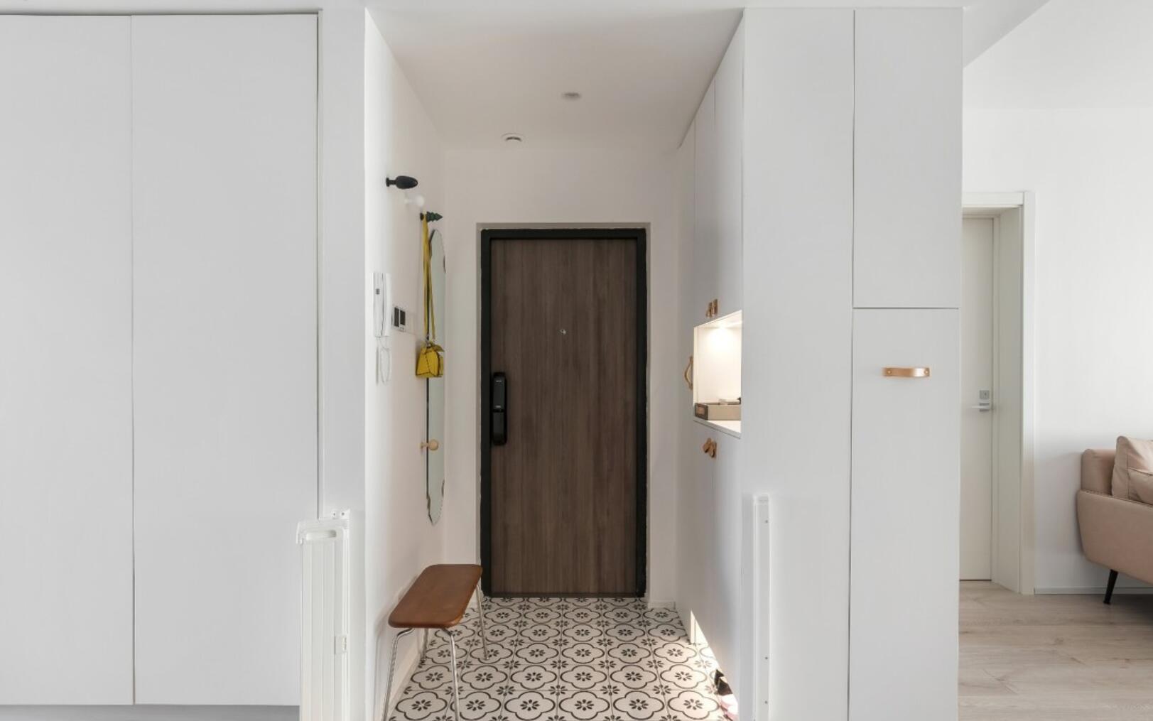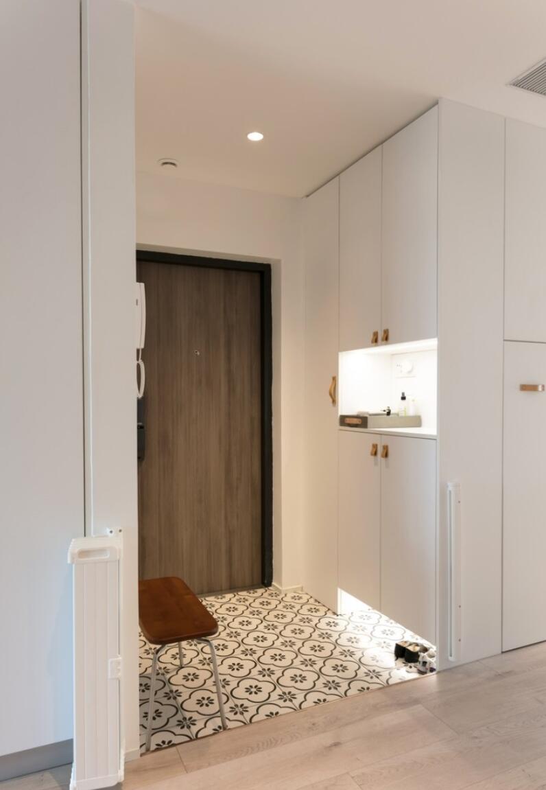 为解决原户型没有玄关区这个问题,利用铺地暖的高度差,直接给入户区做下沉式处理,再通过双面鞋柜围合,立马就有了一个集换鞋、仪容整理、收纳等功能为一体的完整落尘区。同时,加装上伸缩栏杆后,还起到了挡住狗子的作用。