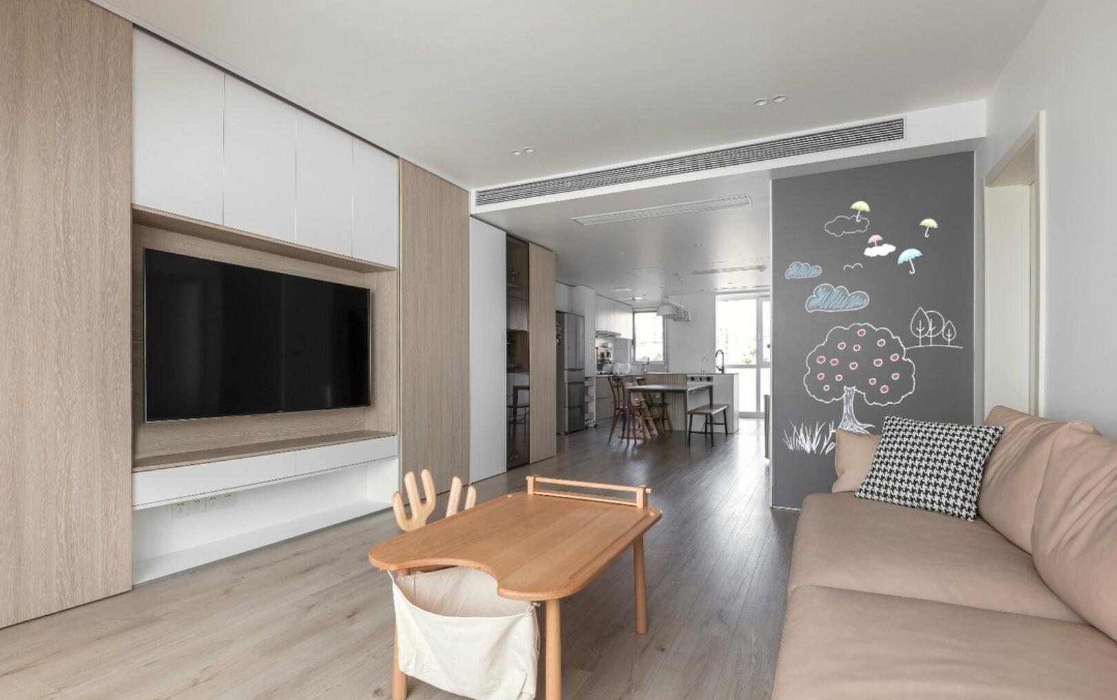 考虑到孩子正在成长,不利于接触电视,所以电视墙的柜子,分成了两部分来设计。中间为电视区,两边为隔层架。这样一来,既满足了孩子的绘本及杂物收纳,也可以完全将电视机遮挡起来,从而实现开合自如。