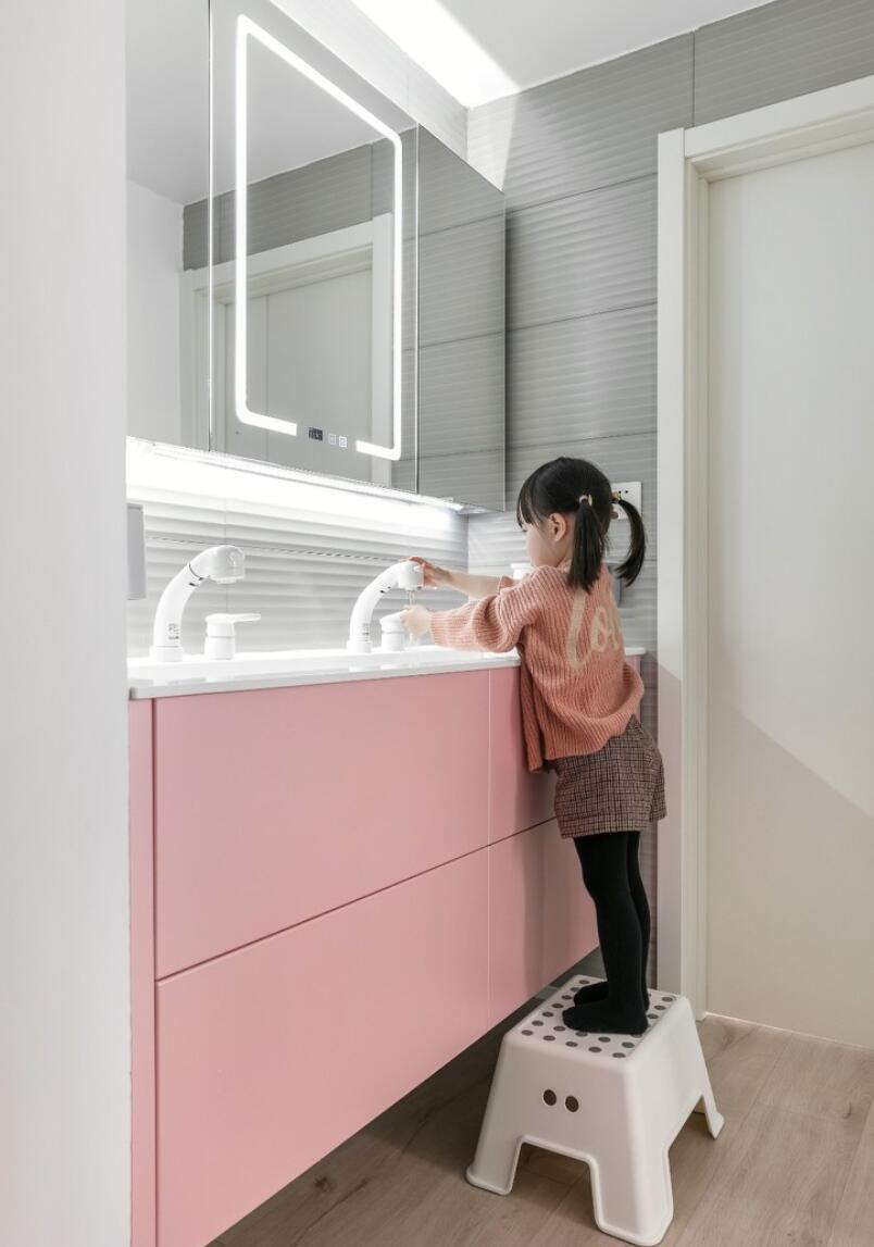 利用主卧门洞内退后的面积,设计的台盆区,则配置了双面盆,以满足多人使用的需求。同时,柜体悬挂,既轻盈又方便了小板凳藏于其中。