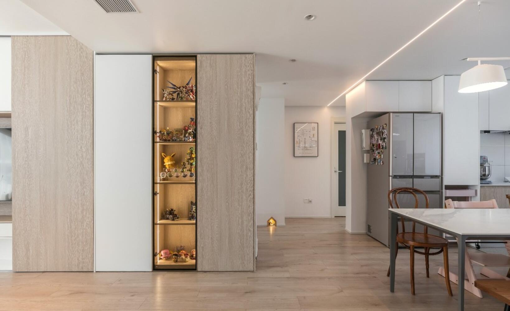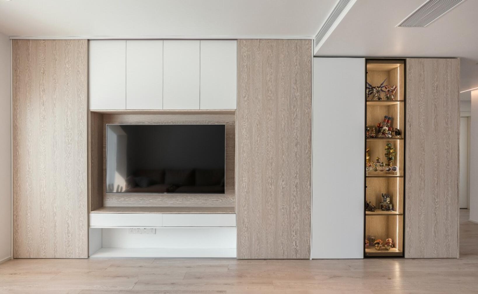 入户第一视角,由于电视墙采用了储物柜设计,所以将靠近玄关区的这部分柜体,做成半开放式隔层柜,并摆满手办,既起到了美化入户视觉的作用,也避免了狗子破坏。