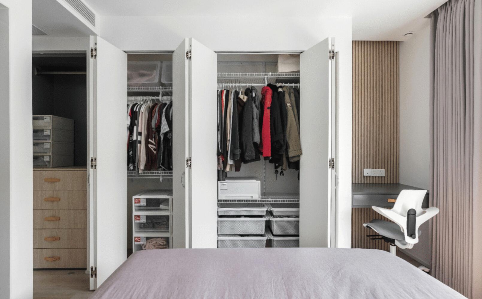 相较于客餐厅,主卧则以素雅的基调为主,以营造出安宁、沉稳的睡眠环境。而衣柜则设计在了床头对面,柜体内部放弃传统的木板隔层,并选择宜家艾格特,既实用又灵活。同时,衣柜两边分别增加抽屉柜、梳妆台,也是实用性的体现。