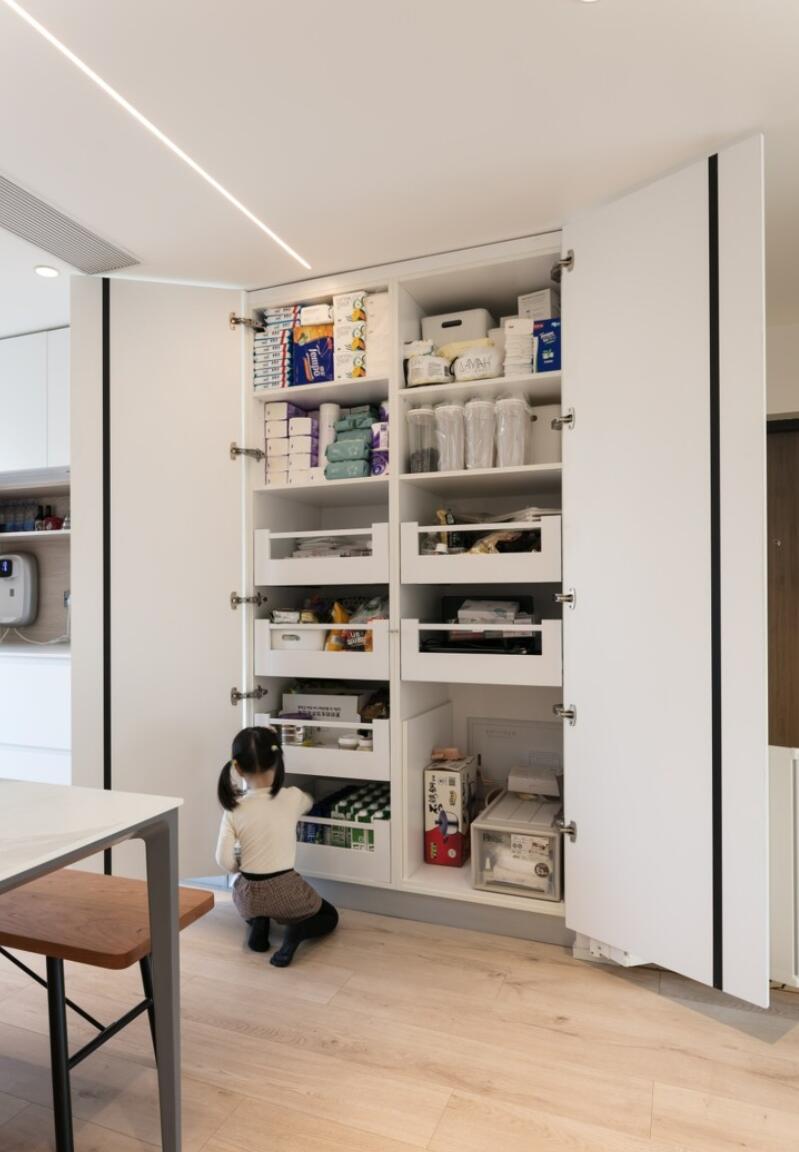 餐边柜收纳展示,虽说柜体内塞了大量的物品,但整洁的收纳方式,却也体现出了屋主对生活的自律。当然,也只有良好的收纳习惯,才能最大化拓展柜体的收纳能力。