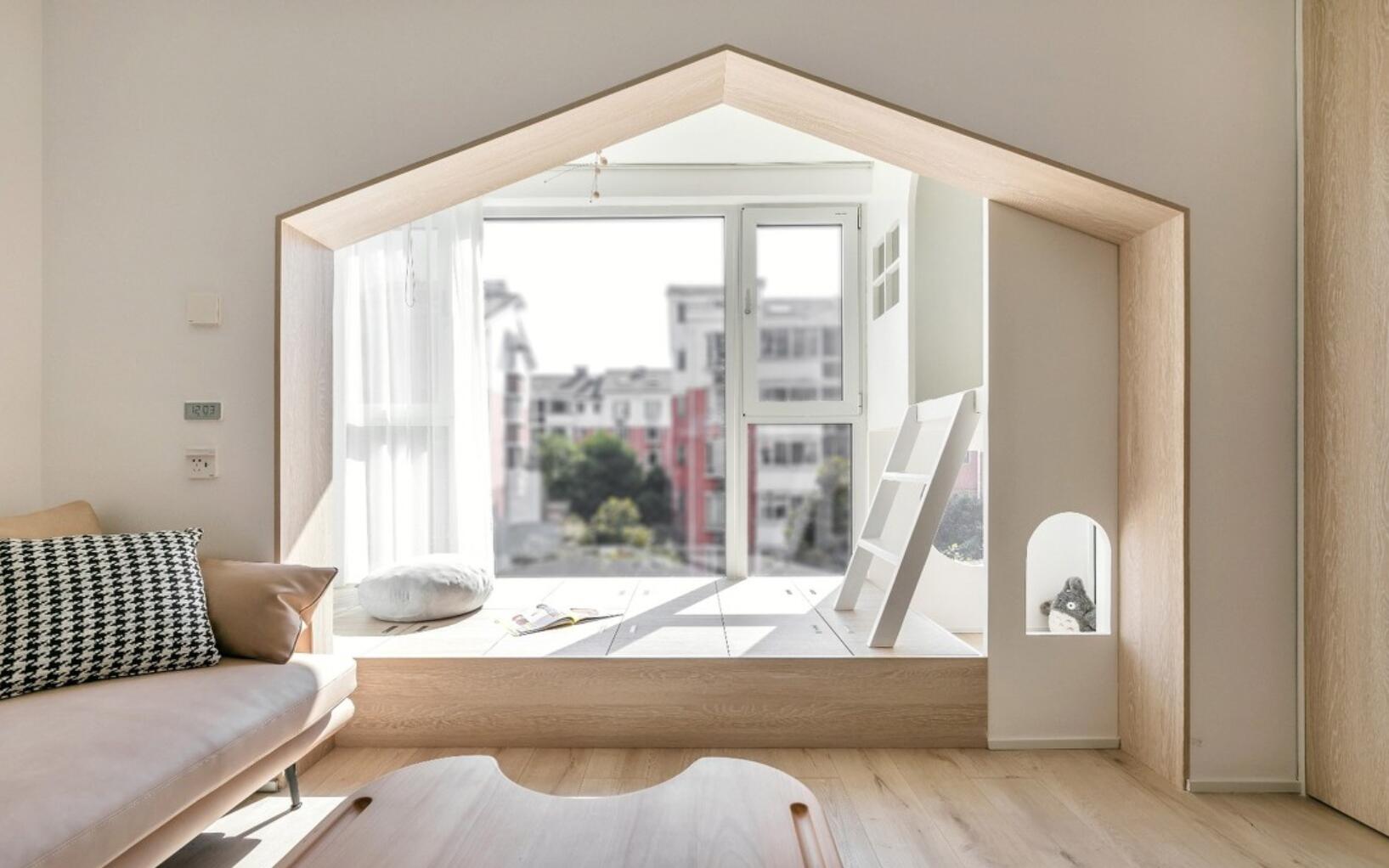 南阳台算是全屋最有特点的一块区域了,放弃常规的家政功能定位,并用榻榻米抬高,以及将门洞垭口设计成三角尖顶,立马就为孩子打造出了一个极具趣味性的玩耍区。同时,还兼具了日常收纳及休闲的功能。