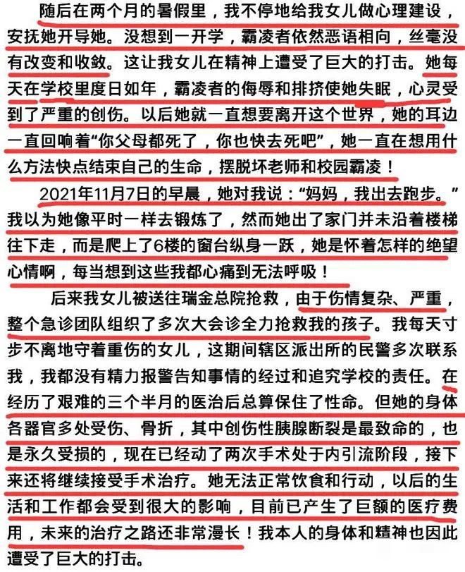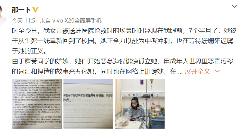 在此之前,邵一卜的妈妈用邵一卜的账号发文,讲述了自己女儿因同学嫉妒被恶意诽谤孤立,在学校长期遭受校园暴力,不堪忍受校园霸凌,去年更是从6层楼跳下,还好抢救及时,但也因此遭受重伤而住院。