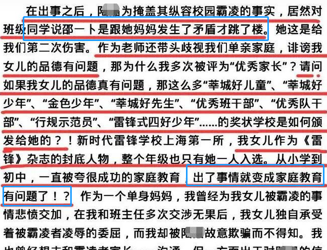 轻生事件发生后,班主任还公开造谣邵一卜跳楼是因为母子矛盾所致。