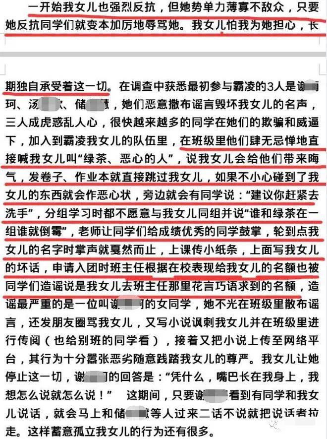 而那十几位对她霸凌的同学,因为嫉妒她,用成年人世界里恶毒污秽的词汇和捏造的故事来丑化她,同时也在网络上诽谤她,在精神上不断地折磨她、霸凌她。