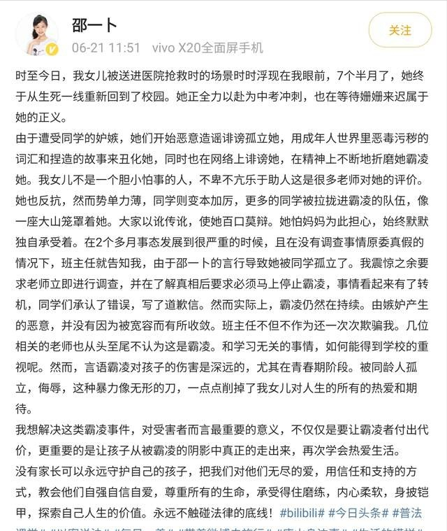 6月22日,小有名气的童星邵一卜,其母亲再次在社交平台发文,实名举报不作为的班主任、校长以及10几名涉事学生,要为女儿讨个公道。