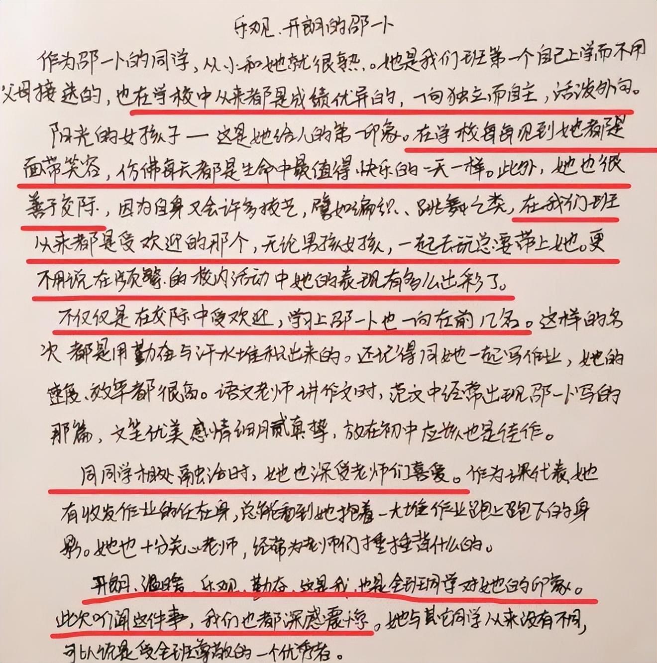 邵一卜轻生事件发生后,也有同学为她写亲笔信,说她是一个乐观、开朗、独立、优秀的女孩子。