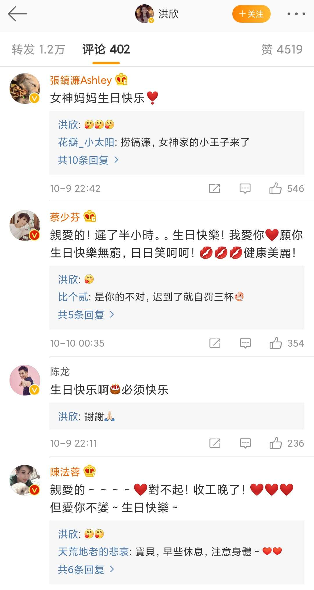不过,随后儿子张镐濂、好友陈龙、好闺蜜蔡少芬和陈法蓉等纷纷在评论区送上生日祝福,洪欣也一一回复了。