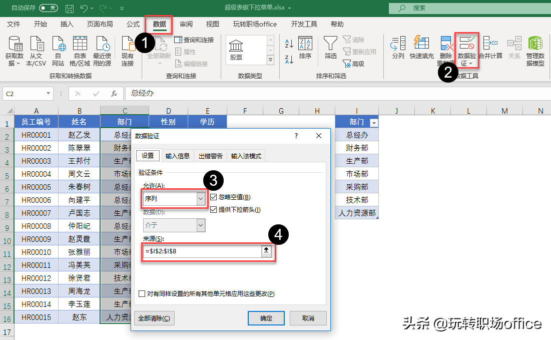 选中C2:C16数据区域,在【数据】选项卡【数据工具】功能区选择【数据验证】,在弹出的【数据验证】窗口中,【允许】下拉列表选择【序列】,鼠标定位在【来源】文本框中,选择I2:I8数据区域,然后点击【确定】。