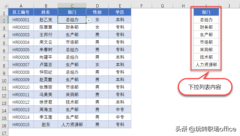 如果我们想删除下拉菜单的内容,直接把I列对应的内容删除,这样下拉菜单中就会去除这项内容,例如删除"总经办"。