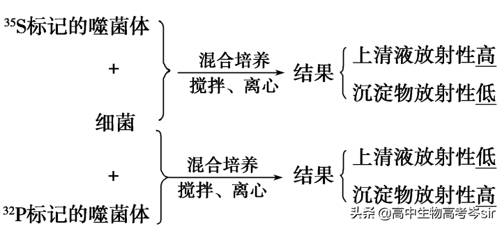 搅拌的目的是使吸附在细菌上的噬菌体与细菌分离,离心的目的是让上清液中析出重量较轻的T2噬菌体颗粒,而离心管的沉淀物中留下被感染的大肠杆菌。离心后,检查上清液和沉淀物中的放射性物质发现:用35S标记的一组感染实验,放射性同位素主要分布在上清液中;用32P标记的一组实验,放射性同位素主要分布在试管的沉淀物中。