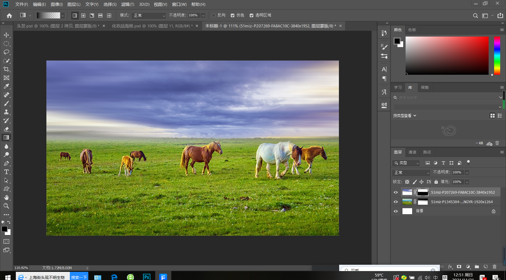 我想把图1的天空和图2的草地无缝的融合,正常合并在一起如图3看起来太假了。这时候我们就会用到蒙版工具了。在两张图片的图层后建两个蒙版,选中各自的蒙版,再在各自的图像上拉渐变(线性渐变),如图4就很好的融合在一起了,是不是很好用。