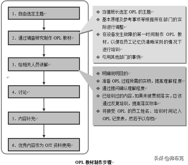 TPM课程准备的主要工作是对OPL课程教材的准备,生产班组长编制OPL教材制作步骤下图所示。