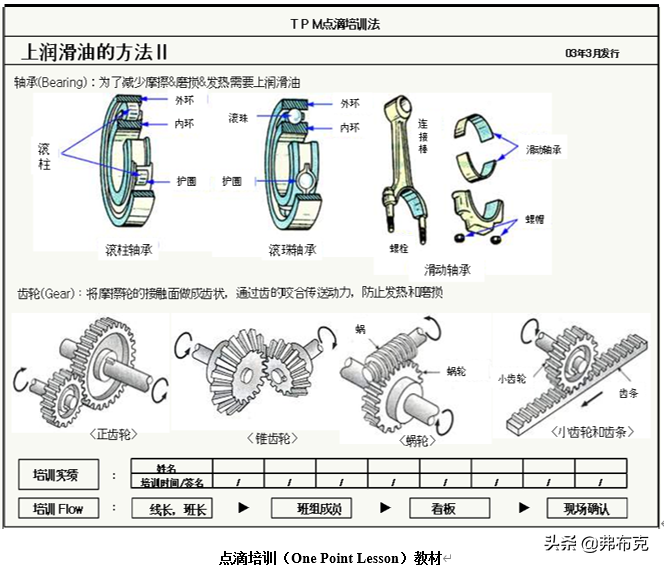 生产班组长制作OPL教材时,应充分利用图表、照片、漫画等方式,把资料做得浅显易懂。同时,生产班组长应明确OPL教材的基本要素应包括标题、编写人、审批、类别、培训对象、培训记录等内容,以车间常用零部件为例,点滴培训法教材范例如下图所示。