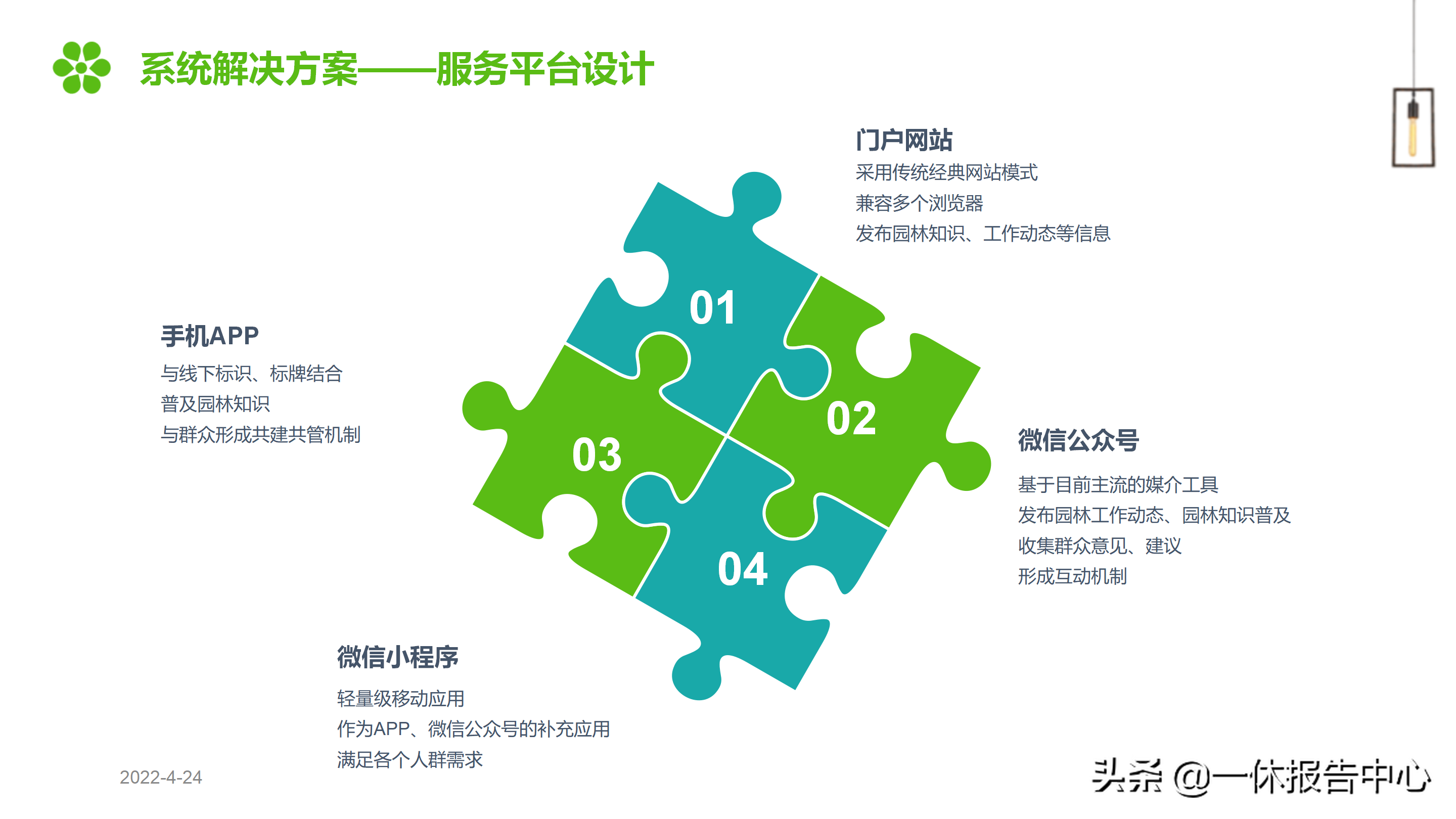 版权声明:我们致力于保护作者版权,注重分享,被刊用文章【公园案例分析ppt(智慧公园园林云平台整体解决方案)】因无法核实真实出处,未能及时与作者取得联系,或有版权异议的,请联系管理员,我们会立即处理! 部分文章是来自自研大数据AI进行生成,内容摘自(百度百科,百度知道,头条百科,中国民法典,刑法,牛津词典,新华词典,汉语词典,国家院校,科普平台)等数据,内容仅供学习参考,不准确地方联系删除处理!;