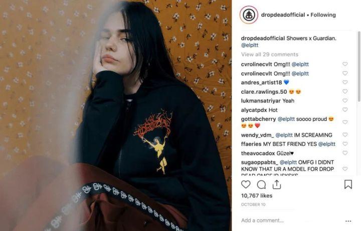 这是一个来自服装品牌Drop Dead Official的例子,它的代言人是拥有近25万粉丝的影响者Elise Pitt: