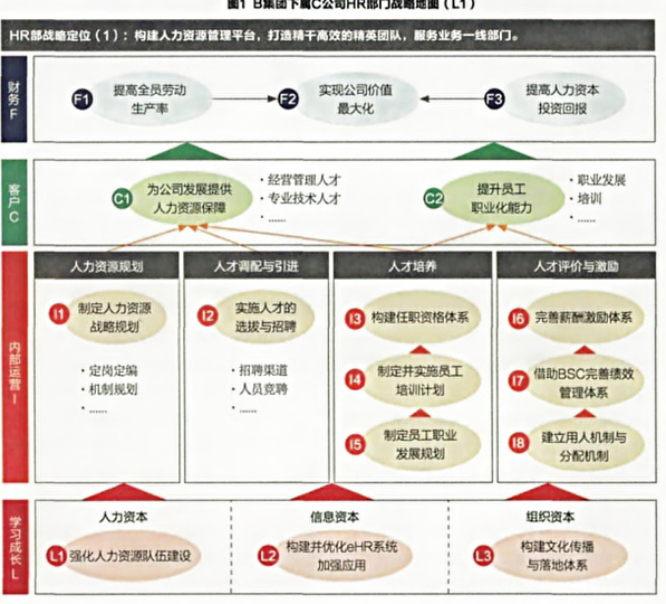作为C公司的人力资源部门,通过绘制战略地图(L1) (见图1)来承接C公司战略目标(LI:加强人才队伍建设)在人力资源管理环节需要达成的目标,并进一步通过行动方案界定相关责任人与具体关键活动(见表5) ,以推进目标达成。