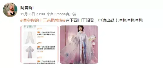 十三余以西施、貂蝉、王昭君等游戏角色皮肤为灵感,打造了多套汉服,用轻盈飘逸的汉元素演绎人物风情,打破二三次元界限,让普通人也能拥有游戏中的“仙气飘飘”,吸引了一大批电竞+汉服爱好者,小姐姐们纷纷在微博晒图。