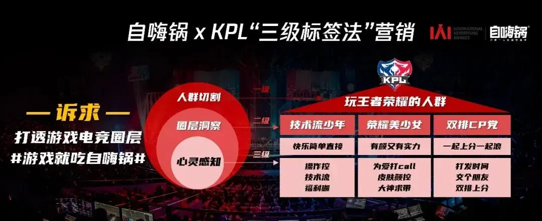 值得一提的是,在第21届IAI传鉴国际广告奖上,由自嗨锅选送的KPL(王者荣耀职业联赛)电竞营销案例战胜3000+作品(获奖比例0.1%),斩获垂直类全场大奖。