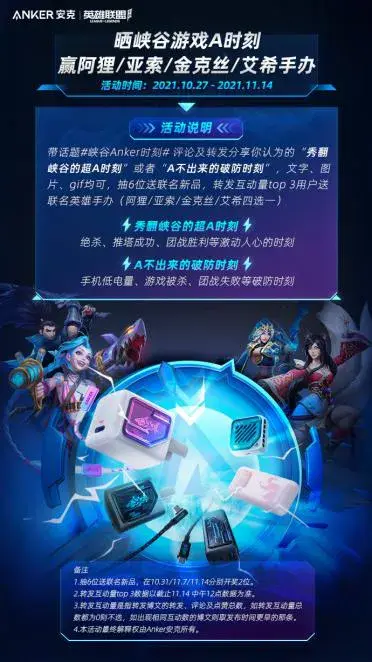 英雄联盟手游上线后,智能充电品牌Anker安克也正式宣布与其联名,以“再A一下就能赢”为主题,针对游戏玩家手机发热卡顿、充电慢、手机电量不持久等痛点,推出了9款授权联名产品,包括快充线、充电宝、散热器等。