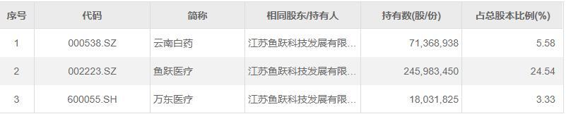 江苏鱼跃科技不仅是鱼跃医疗的第一大股东,持有24.54%股份,还持有另两家A股上市公司,云南白药和万东医疗5.58%及3.33%股份。此外,吴光明单独持有鱼跃医疗10.32%股份,为第二大股东,吴群则持有鱼跃7.72%股份,为第三大股东。