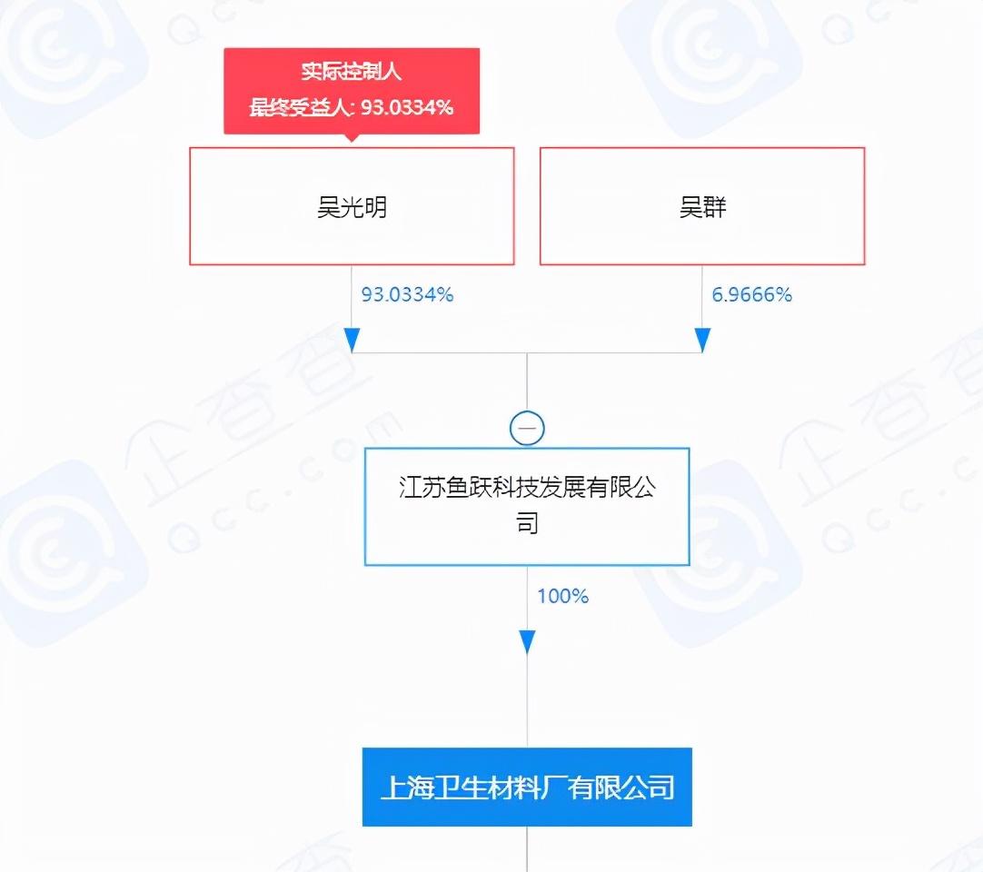 企查查显示,上海卫生材料厂有限公司成立于2012年,注册资本达1.55亿元,主要从事生产医疗器械、药品、工业用胶带纸、斑贴试验胶带,货物及技术的进出口等业务,为江苏鱼跃科技发展有限公司的全资子公司,吴光明与吴群间接合计持有100%股份。