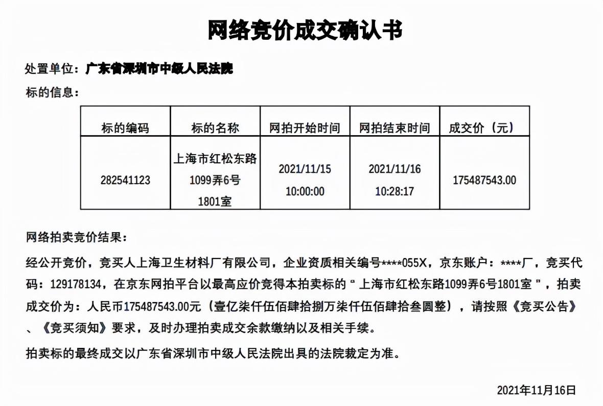 数据显示,该公寓位于上海闵行区红松东路1099弄6号,建筑面积达665平米,起拍价为7154万元,并在上百次加价后,最终推至1.75亿元高价,比起拍价多出近1.5倍。每平米价格虽未达上文中介所说的30万元,但也有26.3万元,而其竞买人是上海卫生材料厂有限公司。