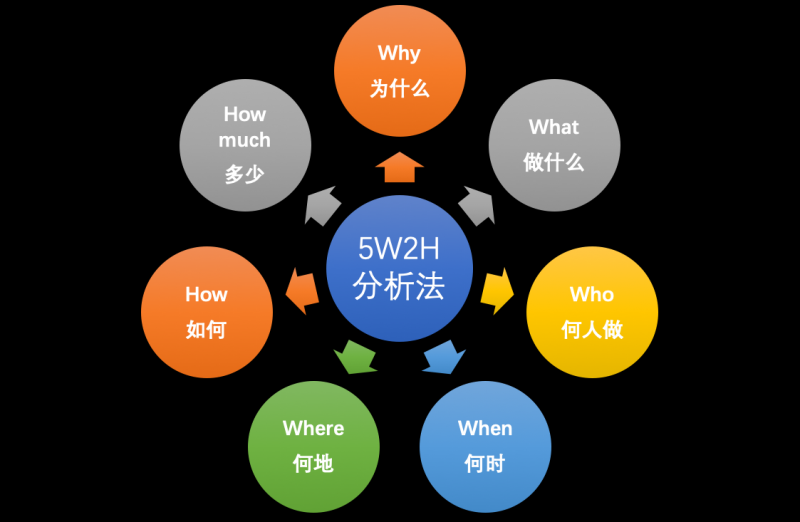 5w2h分析法又叫七问分析法,是二战中美国陆军兵器修理部首创。简单、方便,易于理解、使用,富有启发意义,广泛用于企业管理和技术活动,对于决策和执行性的活动措施也非常有帮助,也有助于弥补考虑问题的疏漏。
