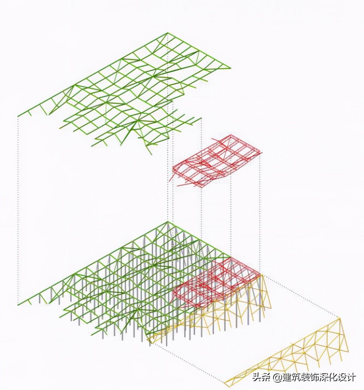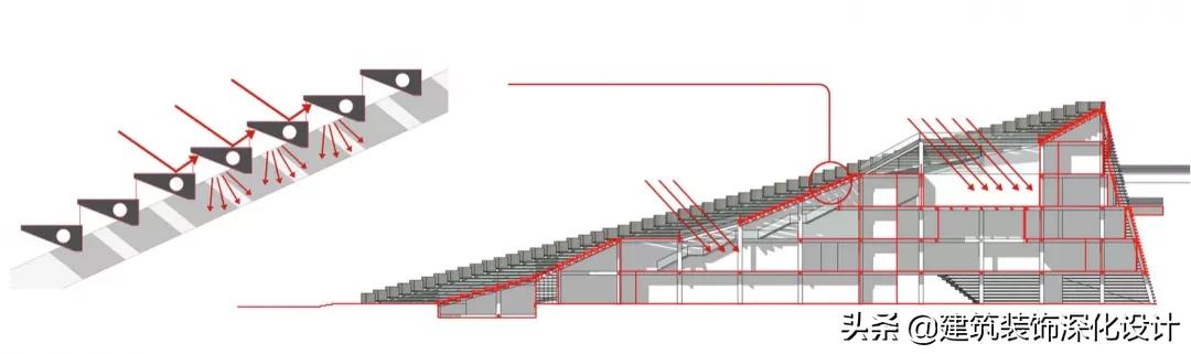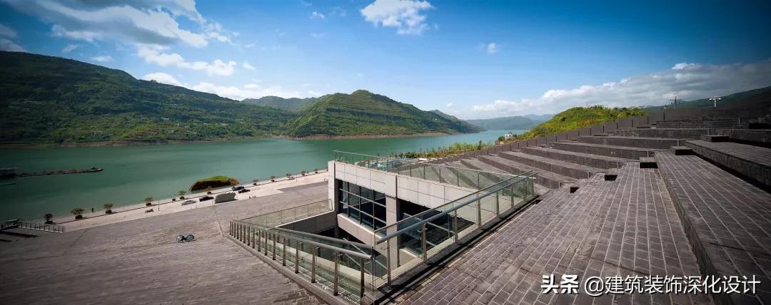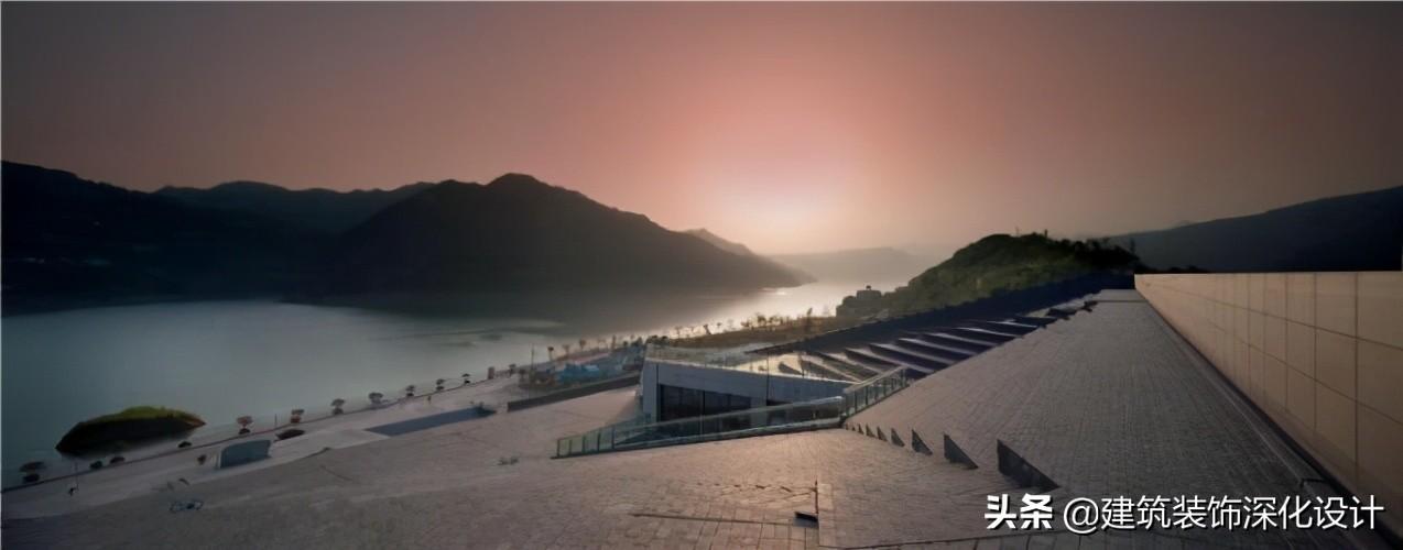 人们可以穿过建筑从山体到达水边,沿途浏览建筑内部的各项活动。建筑屋顶采用台阶式屋顶形式,形成城市的公共空间,如观景的看台,与传统的长江大坝的空间使用相呼应,创造出蕴含传统意境的建筑实体,以表达城市的集体记忆。
