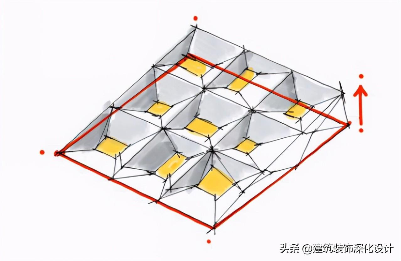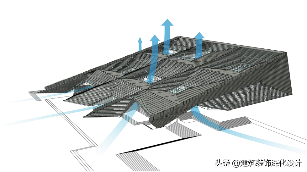 生态利用:建筑以中国传统的四合院形式为文本,采用九宫格式的院落结构,以此扩展、提炼。结合建筑的功能,利用院落天井和顶面台阶之间的间隙,引室外自然光入室内,为建筑提供良好的采光和通风。