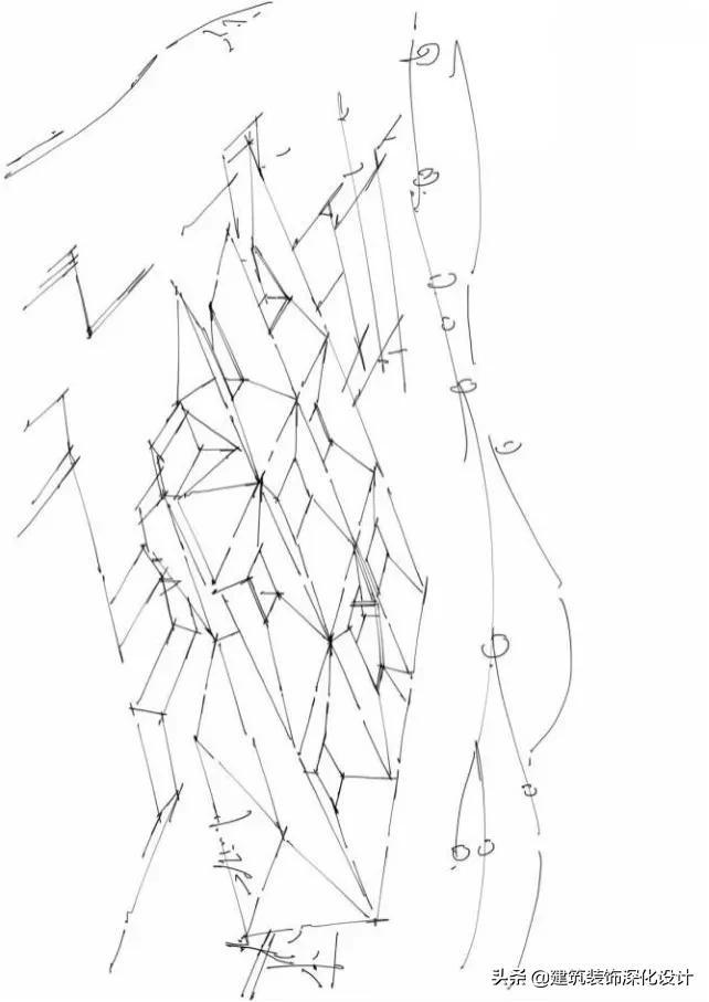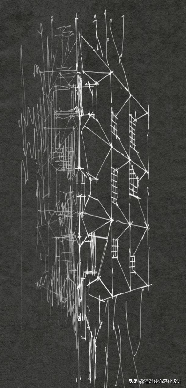 本部分在实景效果的基础上通过手绘概况其形体特点,同时也研究分步骤展示手绘效果的表达。并非每个项目收集的信息都有合适的角度,本次尝试将缺乏细节、环境的小分析图、模型照片进行转译表达,利用其主要结构线,结合其他信息(总图、实景照片)增补周边环境与材质细节。