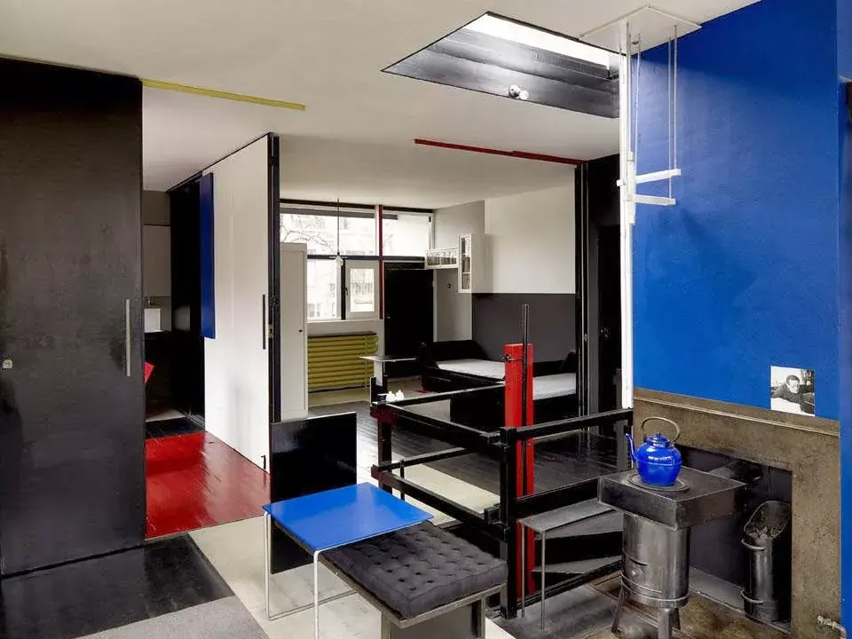 室内的家具也完全是里特维尔德签名式的设计:红、黄、蓝色彩的运用以及构成式的家具设计。