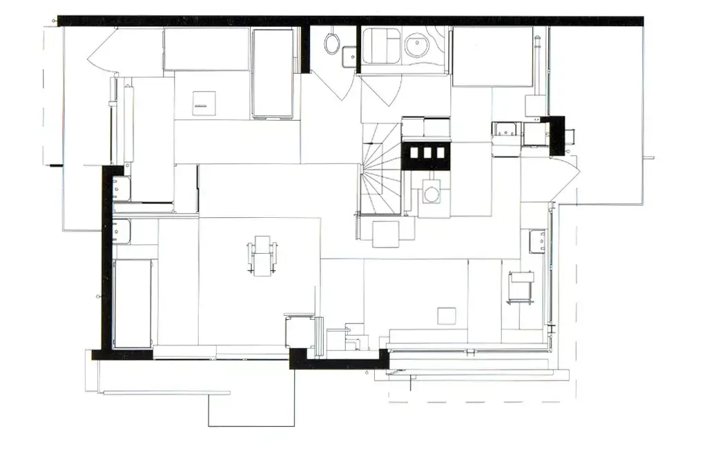在二楼,取代固定隔墙的是一套划动隔墙系统。施罗德夫人提出希望可以在空间上有更多的灵活性来满足她和三个孩子的生活。随着隔墙系统的分隔,每个人都有了自己的房间。当孩子们不在的时候,将隔墙全部打开,又是另一番空间体验。