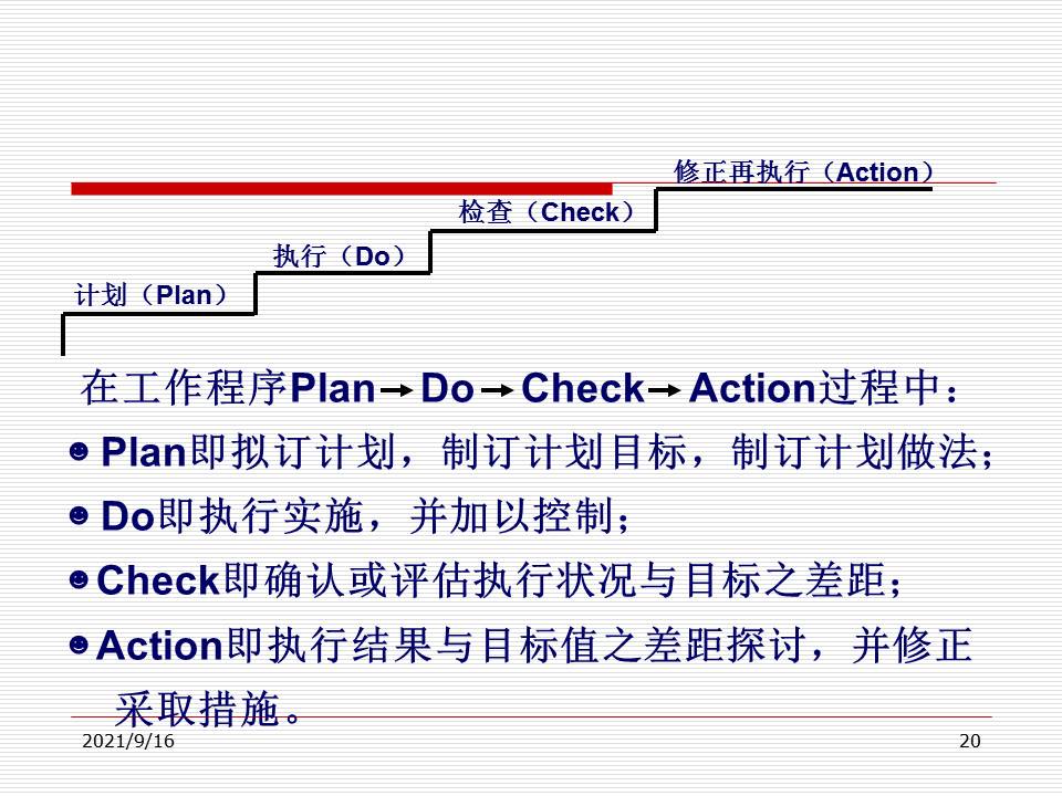 PDCA是英语单词Plan(计划)、Do(执行)、Check(检查)和Action(行动)的第一个字母,PDCA循环就是按照这样的顺序进行质量管理,并且循环不止地进行下去的科学程序。