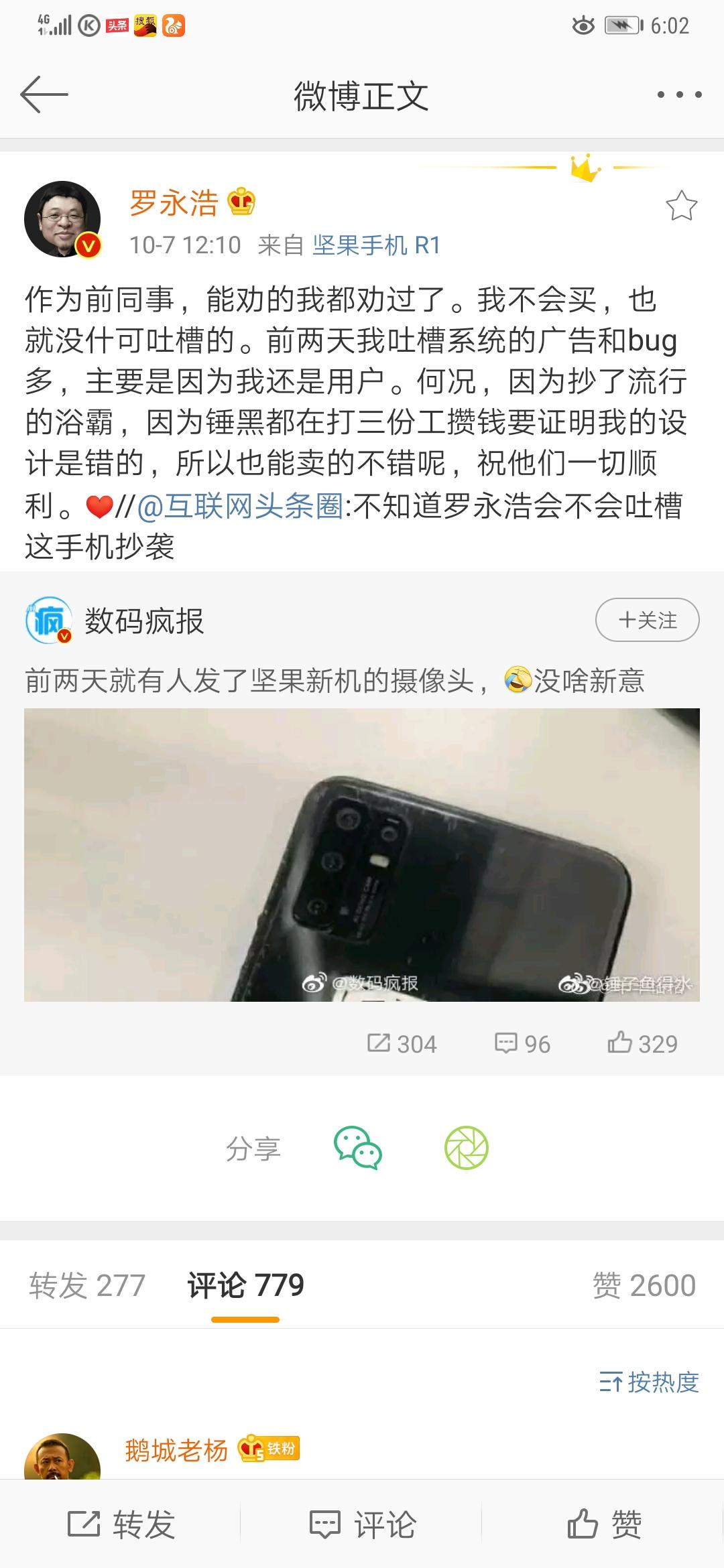 事情经过大致是这样的:10月7日,罗永浩转发坚果新手机的网传照片称:“作为前同事,能劝的我都劝过了。我不会买,也就没什可吐槽的。前两天我吐槽系统的广告和bug多,主要是因为我还是用户。何况,因为抄了流行的浴霸,因为锤黑都在打三份工攒钱要证明我的设计是错的,所以也能卖的不错呢,祝他们一切顺利。”