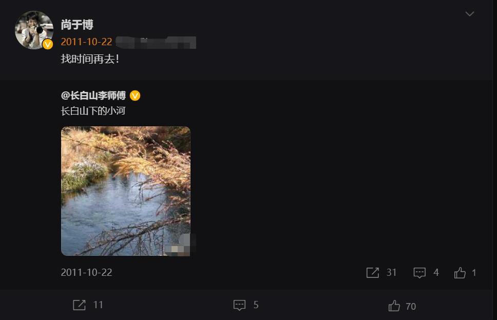 点开尚于博生前本人发的最后几条微博,他转发了一张照片,图中是长白山下的小河,风景宁静而秀丽。