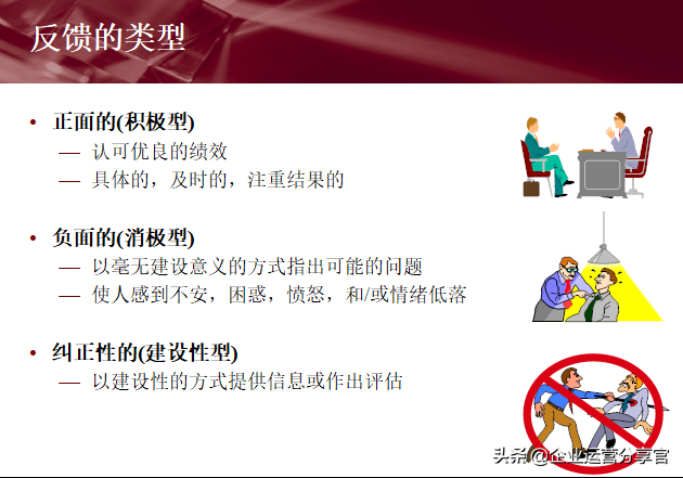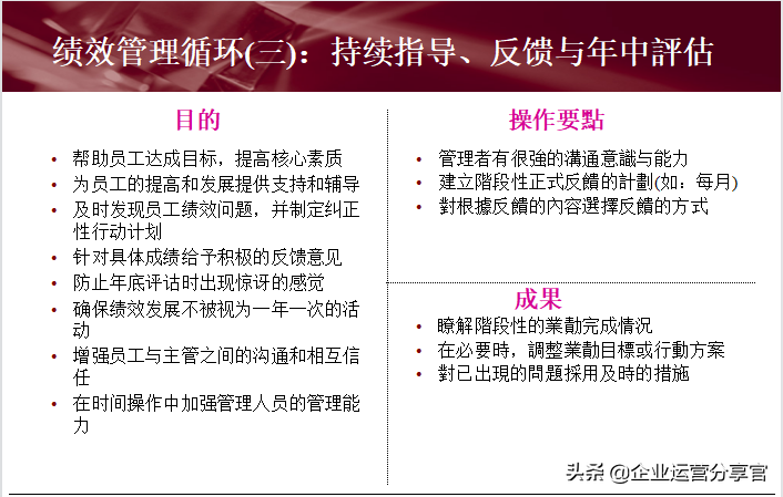 沟通公司经营方向的强有力的工具可视的,一致的,明确的绩效/发展目标人员管理的一套通用原则发展和提高是企业与员工共同的责任绩效过程的反馈与指导是绩效管理的核心工作,其重要性通常被管理者忽视,关于反馈有这样两段话与大家分享:“尽管有效的经理只花一小部分时间用于收集绩效信息并提供反馈,但结果一贯表明这些小事情产生了大影响”“那么,他们花多长时间用于反馈与指导呢?平均每天14分钟,这并非指比低效的经理多花14分钟。而是共用14分钟 。”