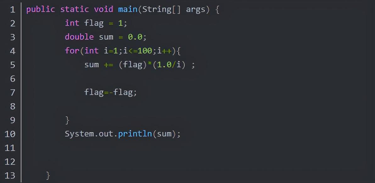 注意点: sum += ( flag ) * ( 1.0 / i) ;这里一定要明确 是1.0 / i ,不是1 / i.另外sum要定义成double类型.