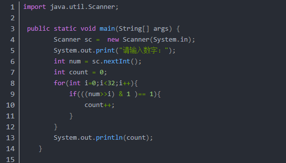 题目内容:写一个函数返回参数二进制中 1 的个数 比如: 15 0000 1111 4 个 1Java代码实现: